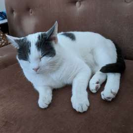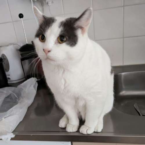 Valkea kissa, musta häntä, musta täplä vasemalla puolella kylkeä, kaksi läiskää päälaella.