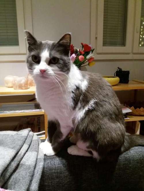 Mustavalkoinen 12 vuotias arka, leikattu naaraskissa, vatsanahka roikkuu