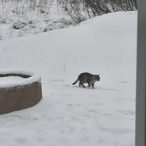 Kuopion maaseudulla Maaningan Kiukoonniemessä liikuskellut jo tammikuusta asti tällainen harmaan kirjava pienikokoinen (tyttö?)kissa. Hännässä poikkeama, olisiko jäänyt oven väliin. Arka, ei tule ihmisten luo. Kuitenkin hyväkuntoisen näköinen. Ei ole paikallisten kissa, selvitetty.