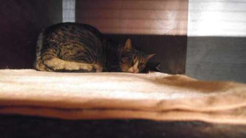 Talteenotettu rusahtavan raitanen iso kissa, valkoisin merkein.