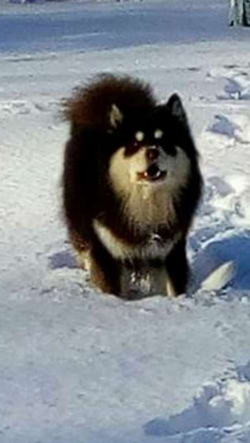 Kylässä ollut uros lapinkoira karkasi. Koira on väriltään ruskea ja vaaleat kasvoiltaan.