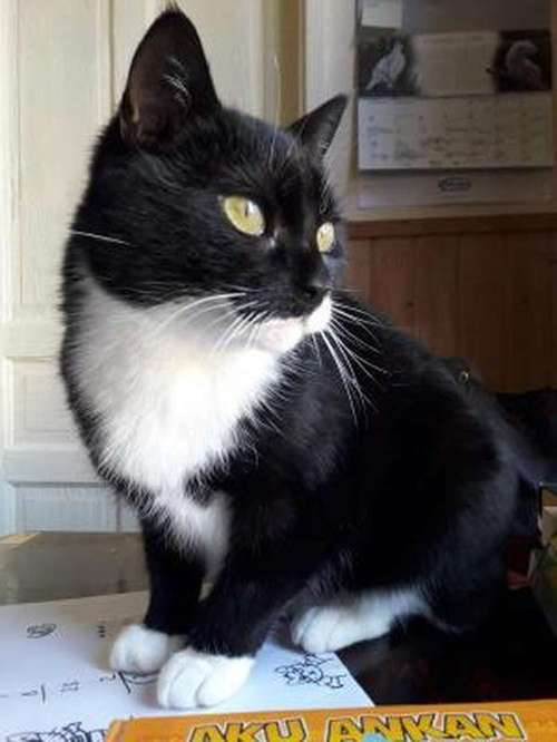 Mustavalkoinen, 10-vuotias isotassuinen kissa.