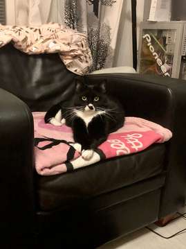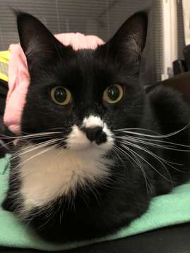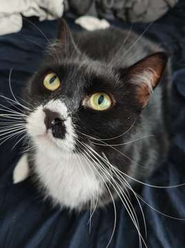Musta kissa, vatsasta valkoinen. Kasvoissa valkoista, nenän vieressä musta laikku ja valkoiset viikset ja hännänpäässä valkoinen tupsu. Kissa on arka, eikä välttämättä anna ottaa kiinni. Kissaa voi kutsua luokseen nimellä. Kaikki havainnot tärkeitä. Kissa on myös sirutettu.
