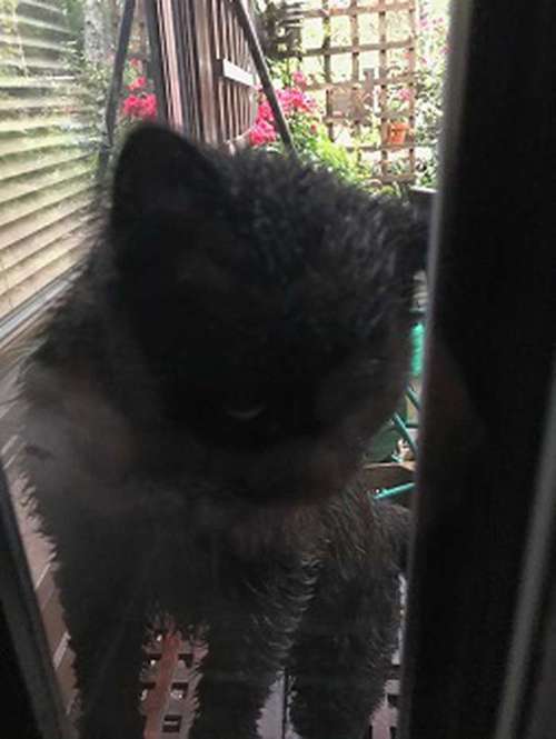 musta pyöreähkö kissa, pannassa vihreä vilkkuvalo