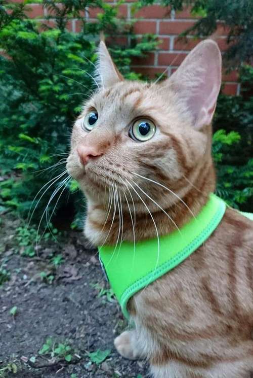 Nuori ja kookas kollikissa kadoksissa. Turkki on lyhyt, punertava ja raidallinen. Korvissa on karvatupsut ja alahuulessa pieni täplä.