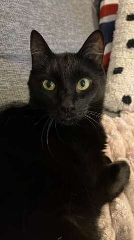 Karkuun vilahtanut sisäkissa Espoonlahdessa. Musta maatiaiskissa, jolla vihreät silmät ja hiukan valkoista kauluksessa. Arka ja kiltti kissa.