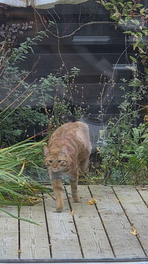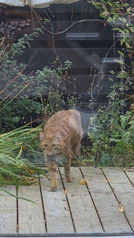 Nähty oranssi kissa pihalla Pohjois-Tapiolassa lähellä Tapiolan asukaspuistoa.