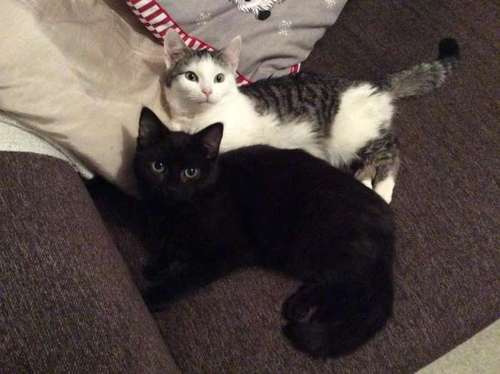 Pieni musta uroskissa jolla musta kaulapanta jossa tiuku. Kissa on pelokas ja minikokoinen.
