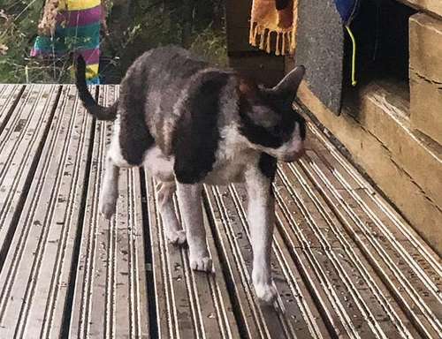 Mustavalkoinen leikattu poikakissa, jolla on punertava nenä. Karannut kotoa 28.6. illalla. Ei ole aikaisemmin ollut kuin pihalla ulkona, josta nyt karannut. Tod. näk. eksyksissä uudessa paikassa. Naukuu kovaa ja luottaa hyvin ihmisiin.