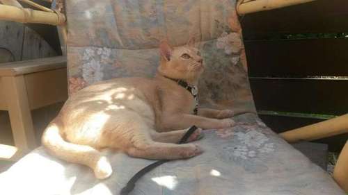 kaulassa kadotessa oranssi panta. Kissa on erittäin kiltti ja sosiaalinen. Kotona huolissaan omistajan lisäksi odottavat äiti ja veli.