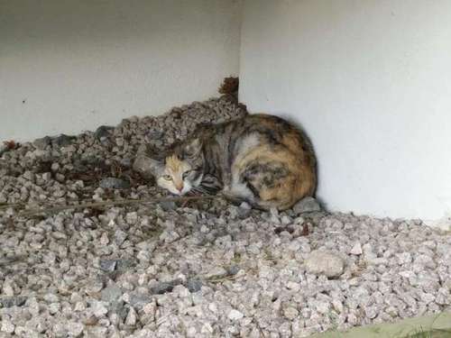 Nuorehko vaalea kilpikonnanvärinen kissa (hopeakilpikonna?), raitoja/täpliä.