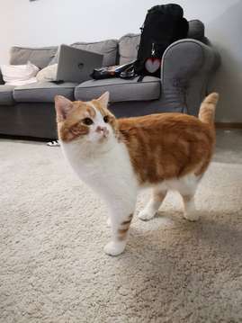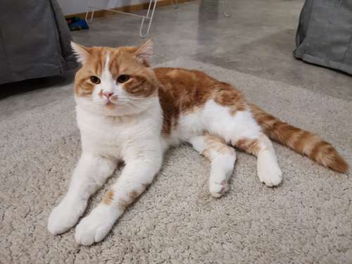Punertava raidallinen kissa. Valkoinen rinta ja vatsa. Iso kokoinen, n.7-8kg.