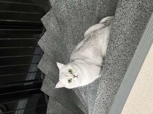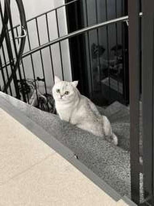 Valkoharmaa isosilmäinen kissa rappukäytävässä