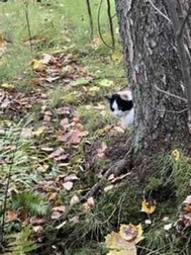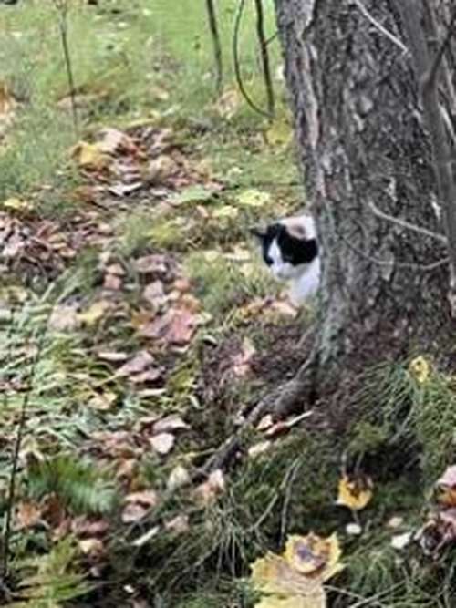 Nähty Laajasalossa, Yliskylässä pieni mustavalkoinen kissa. Ei antanut ottaa kiinni. Lähellä Yliskylän kuntoportaita olevassa metsikössä ja bussipysäkin vieressä.