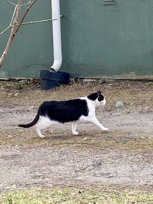 Kymintie, Kumpula, Helsinki. Suurikokoinen mustavalkoinen kissa ilman kaulapantaa.