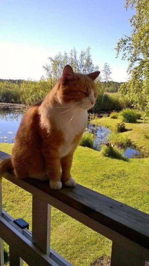 Oranssivalkoinen leikattu tyttökissa, valkoinen kaula ja tassut.
