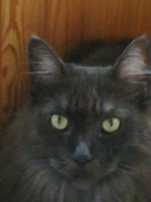 9 vuotias leikattu narttu. Musta-savu eli melko musta missä harmaata. Kookas n. 6kg. Keltaiset silmät.