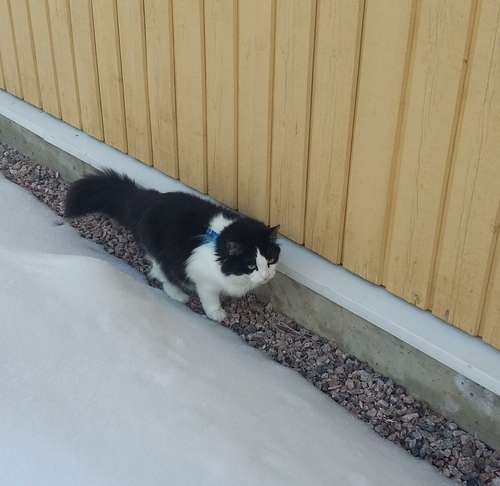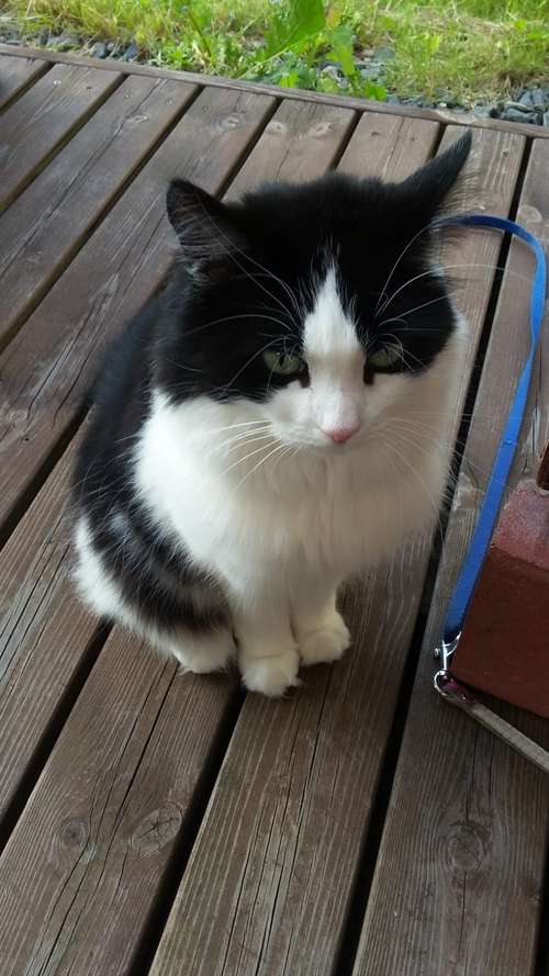 Keravan Sorsakorvessa kadonnut 14-v sirutettu mustavalkoinen pitkäkarvainen naaraskissa. Päällä on siniset valjaat .