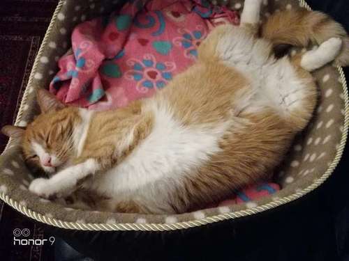Oranssin värinen kissa ja raidallinen. Maha, leuka ja nenään asti valkoinen. Hänellä on myös roikkuva maha.