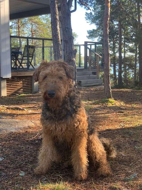 Klaukkala/Toivolan alue. Illalla 31.12.25 noin klo 18 karannut raketteja pelästynyt airedalenterrieri.