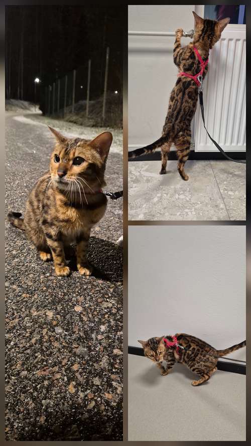 Kadonnut tyttö kissa Myyrmäestä. Leikattu. sirutettu. Kissalla valjaat, punainen kuten kuvassa.