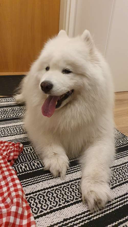 Varistosta löytynyt samojedinkoira harhailemasta. Ei kaulapantaa, käyttäytyi rauhallisesti ja otettu sisälle turvaan odottelemaan omistajaa
