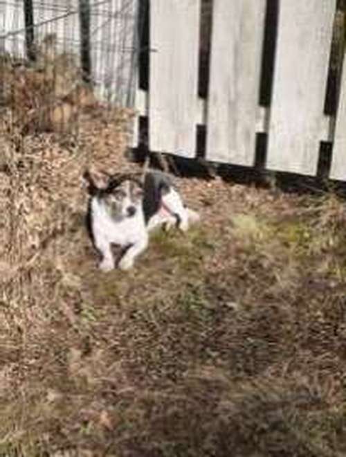 Pieni tricolor värinen sekarotuinen säntäsi pelästyneenä metsään.