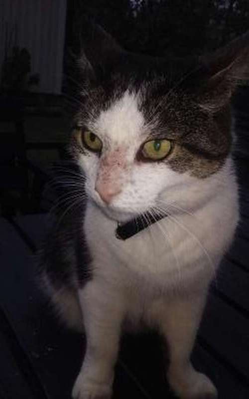 Nenässä ja korvissa tällä hetkellä allergiaa, näyttää tappelujäljiltä, mutta ei ole. Töpöhäntä. Selkä tumma mahassa valkoista. Näköhavainto aamulla, mutta säikähti ja ei antanut itseään kiinni. Matka jatkuii Kaarinasta kotiin Pohjois-Karjalaan kunhan kissa vain saapuisi majapaikkaan.