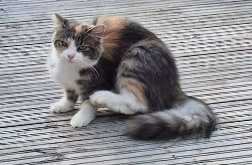 Kesy kissa usean viikon ajan pyörinyt pihassamme. Juttelee paljon, pitää kuitenkin etäisyyttä muutaman metrin.