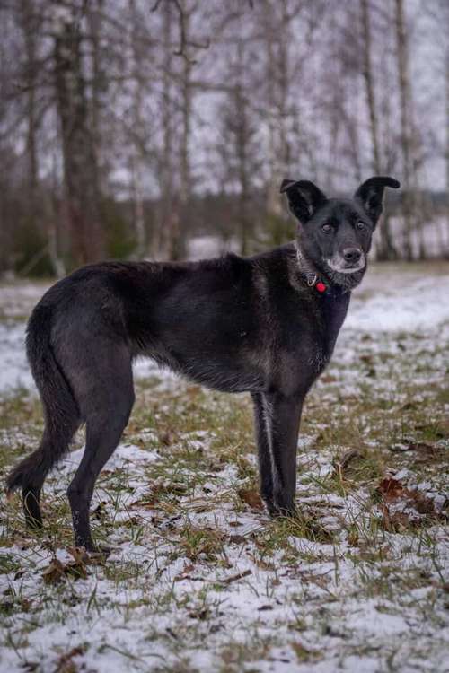 Pöytyän kirkon liepeillä, lilat valjaat, turkoosi viiden metrin liina perässä. Erittäin arka, ei saa kutsua eikä koettaa ottaa kiinni.