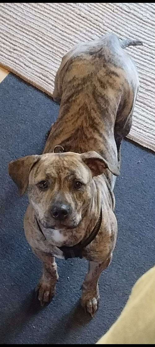 Korkeus 45-50 cm. Mustat valjaat, perässä musta talutushihna, noin kaksi metriä.