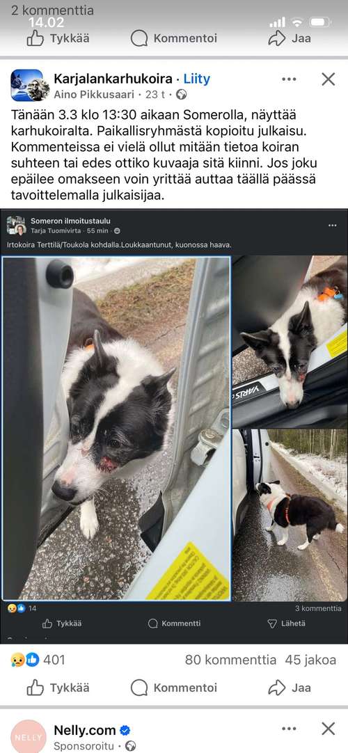Löytynyt julkaisu jossa karannut koira, loukkaantunut. Ei tietojen mukaan ole vielä saatu turvaan tai hoitoon.