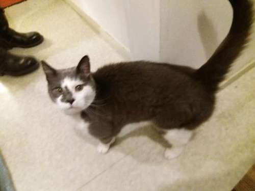 Selkäpuoli harmaa, mahapuoli valkoinen, toinen puoli naamasta valkoinen, harmaa läikkä naamassa.